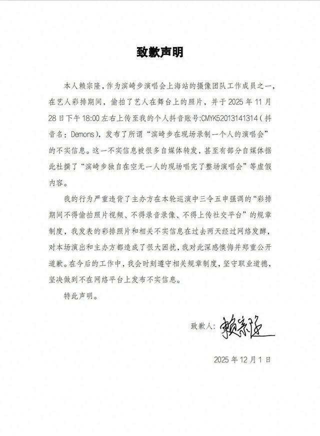 12񀙑日据澎湃新闻报道,所谓滨崎步“一个人的演唱会”信息不实,系彩排期间被偷拍,摄像团队人员公开致歉。       当事人发文,全文如下:       本人赖宗隆,作为滨崎步演唱会上海站的摄像团队工作成员之一,在艺人彩排期间,偷拍了艺人在舞台上的照片,并���日下�:00左右上传至我的个人抖音账号:CMYK52013141314(抖音名:Demons),发布了所谓“滨崎步在现场录制一个人的演唱会”的不实信息。这一不实信息被很多自媒体转发,甚至有部分自媒体据此杜撰了“滨崎步独自在空无一人的现场唱完了整场演唱会”等虚假内容。       我的行为严重违背了主办方在本轮巡演中三令五申强调的“彩排期间不得偷拍照片视频、不得录音录像、不得上传社交平台”的规章制度,我发表的彩排照片和相关不实信息在过去两天经过网络发酵,对本场演出和主办方都造成了很大困扰,我对此深感懊悔并郑重公开道歉。在今后的工作中,我会时刻遵守相关规章制度,坚守职业道德坚决做到不在网络平台上发布不实信息。       特此声明。       此前报道:       11�日下午,滨崎步上海演唱会主办方发布了滨崎�亚洲巡回演唱会上海站取消公告,表示因不可抗力因素演出取消,门票将�天内全额退回。       此次演出原定�日晚举行,为滨崎步亚洲巡演的收官站。       公告中写道:对于演出取消给观众带来的不便,我们深表欺意,敬请谅解!已经购买本场演出门票的观众朋友,无需任何操作,我们已启动退票机制,票款将�日内按原支付路径全额退回。感谢各位观众的理解与支持。       据公开资料,滨崎步,1978�񀙒日出生,日本女歌手、词曲作者、演员、模特、主持人。1998年,发行首张单曲EP《pokerface》正式出道,2001年�年间,她凭借单曲《Dearest》《Voyage》《NoWayToSay》连续三年获得日本唱片大奖“最高荣誉大奖”,2012年,滨崎步的单曲及专辑在日本本土的总销量突�万张,位列日本女歌手唱片销量冠军,为日本女歌手冠军单曲纪录保持者,且三次获得日本唱片年度总销售额冠军。       版权归原作者所有如有侵权请及时联系